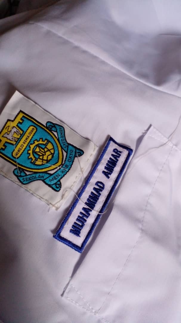 Tanda nama pada pakaian sekolah, nak tampal kat mana lencana sekolah, kedudukan lencana sekolah yang betul, kedudukan nametag yang betul .